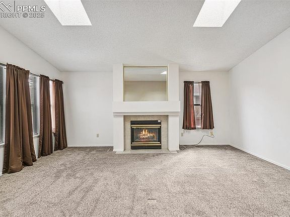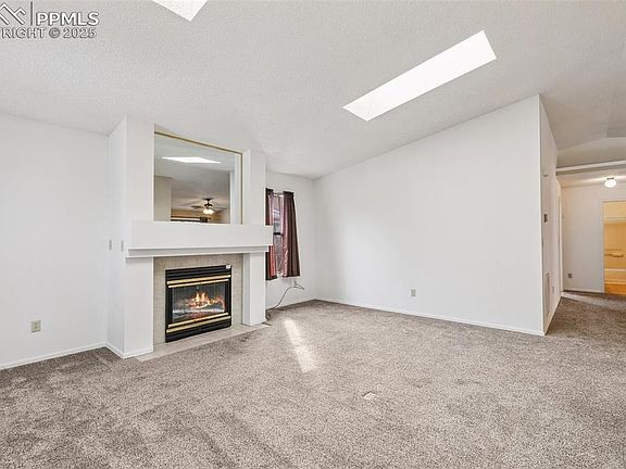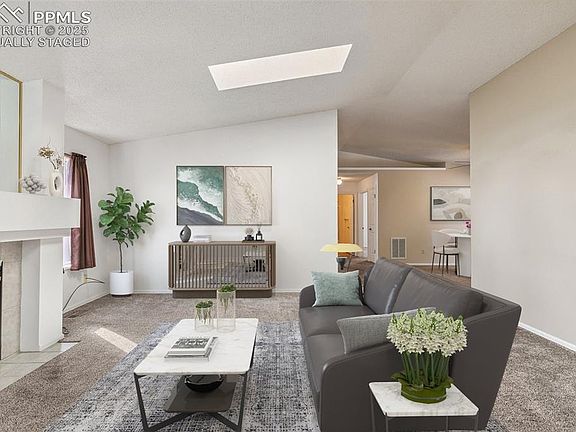 Charming Villa in Brookdale at Skyline. This 55+ community has incredible amenities including, clubhouse, pool, gym, and so much more. Enter this move-in ready townhome and you are greeted by a spacious living room with fireplace, windows and skylights for natural light, and entry closet. Separate dining area with access to the private patio with year-round awning. Kitchen boasts lots of cabinets, solid top counters, laminate flooring, and pantry. Primary bedroom with en suite. Additional bedroom and hall bath. 2 car garage with washer and dryer included. Newer paint and carpet, A/C and so much more. Close to shopping and restaurants. Come live near the foothills of west Colorado Springs and make it your new place to call home.