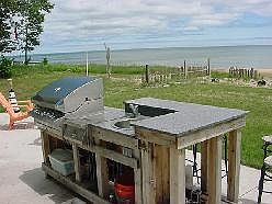 Lake Huron Enjoy the sugar sand beach directly off the concrete patio with built in grill, granite counter top, and work sink. Great swimming for the children; shallow and no rocks. Sixty feet of beach is plenty to enjoy the water and cuts the property taxes to a reasonable amount. The gas log fireplace provides a cozy great room on a cool evening. Two master suites and a split floor plan give privacy throughout. Enjoy miles of sand beach to walk on, several quality golf courses, canoeing, fishing, hunting and snowmobiling from this quality Lake Huron vacation home. 13-0042 $299,000