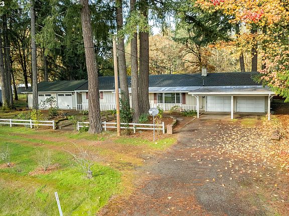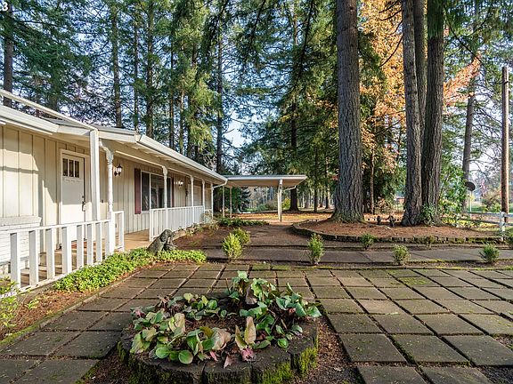 This is the one-level country home you have been looking for! On almost 1 acre, you get the rural lifestyle plus sense of spaciousness and privacy without all the upkeep. Besides the beautiful setting, the main highlight of this home is the stunning, wood-lined, open-beam, vaulted ceiling that runs throughout the entire house and into the 672 sqft garage, allowing for the possibility of a beautiful and cohesive expansion. The spacious living room features an oversized, south-facing picture window and a wood-burning fireplace leading into the dining area with a slider to the back and kitchen with granite counters, eating bar & newer appliances, all included. This home features 3 bedrooms and 2 full bathrooms...the primary bedroom ensuite has double closets and attached bath. Outside you will find a 720 sqft detached shop (in addition to the covered carport and huge attached garage!) with heat, electricity and skylights plus 2 small outbuildings, hot tub, beautiful landscaping, tons of mature trees and plants and shrubs. Don't miss the two convenient driveways and multiple spaces to park an RV, boat, trailer and lots of vehicles. Also features new interior paint, newer vinyl windows, newer doors, newer well pump, Culligan whole house water filter, 2-head ductless heat pump system, tons of built-in storage in the garage and shop and sweet covered porches in front and back. This property is definitely worth the short drive...only 3 minutes to Fern Ridge, 6 minutes to Veneta, 12 minutes to Jerry's Home Improvement and 20 minutes to Costco!