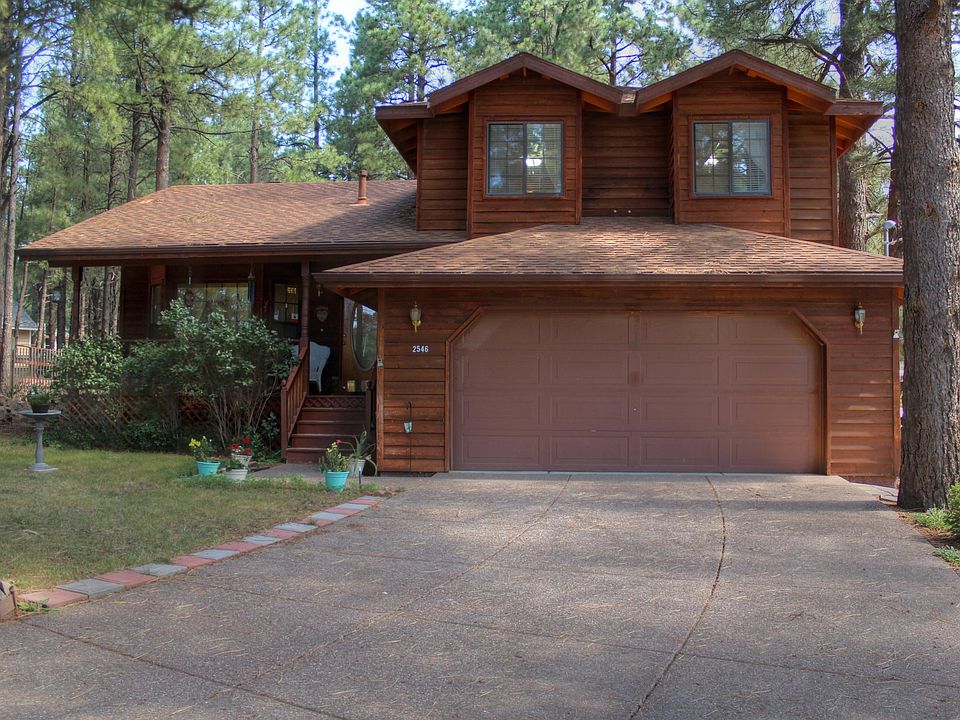 Nice, well-kept 3 bedroom, 2 1/2 bath, 1862 sq. ft. single family home with a 2 car garage in Kachina Village. This home sits on a level 10,069 sq. ft. treed corner lot ( .23). Enjoy the downstairs floor plan with vaulted ceilings in kitchen & living room, a separate family room with gas fireplace, half bath & laundry room with basin sink. Spacious bedrooms upstairs including a large master suite with a walk-in closet, his & her sinks and it's own deck. Heavily treed, nice landscaping with a patio and a large deck outback. This would make a great year round home with easy access to town amenities. Don't forget to check out the virtual tour!