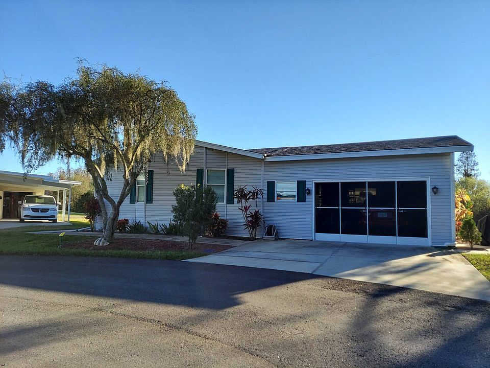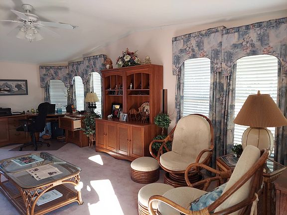 A 1999 Palm Harbor Golf View Home with garage available. This home has just under 2000 square foot of living space under central air & heat. You will find drywall throughout the home, double pane windows, tile flooring in kitchen, hall, lanai & bathrooms with carpet in the living, dining, & bedrooms. There are 2 separate living rooms and a glassed in 4 seasons room that over looks the 5th and 6th holes of the Big Cypress Championship Golf Course. In the kitchen there is an over the range microwave, glass top stove, & French door refrigerator with plenty of counter and cabinet space. The formal living / dining room has trey ceilings and horizon widows. Master bedroom has walk-in closet and master bath with single vanity and walk in shower. A spacious guest bedroom with room for 2 twin beds and reach in closet. Guest bathroom has tub/shower combo. The one car garage has enough space for an SUV, golf cart, workbench and storage space that will lead you into the 4 seasons room. The AC was replaced in October of 2021 and the roof replaced with 30 year architectural grade shingles in 2007. This home is being sold Turn-Key with a Golf Cart Contact the Cypress Lakes Sales and Information Center for More Information. This home is situated on leased land.