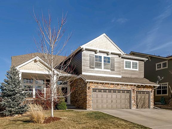 Beautifully upgraded house backing to open space & walking trails in The Meadows. Mountain views! Directly adjacent to a cul de sac and a short walk to schools & parks. Tons of upgrades, including hickory floors & Pottery Barn lighting fixtures. Main floor features family room w/ vaulted ceiling, tons of windows/light, fireplace & mantle, living room, dining room, den/office, sun room, powder room, laundry room, and gourmet kitchen w/ double oven, gas cooktop, upgraded island w/soapstone counter, granite, cherry cabinets, refrigerator, dishwasher, walk in pantry & eating area. Master Suite w/ views & 5 pc bath w/granite counters, upgraded shower, huge walk in closet w/built ins & windows. Spacious loft can be easily converted to 4th bedroom. Ceiling fans in all bedrooms. Huge unfinished basement w/crawl space. 2 furnaces, 2 Central AC units. Covered front porch. Fenced backyard w/oversized stamped concrete patio. 3 car garage. Low HOA fees include 2 pools! Douglas County Schools!