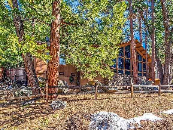 3 Bedroom, 2.5 BA mid-century modern mountain home located at the end of a cul-de-sac in the much sought-after community of Idyllwild-Pine Cove. The property is adjacent to the national forest with the sunset streaming through the wall of windows, or enjoy it from the screened in front porch with the wide plank wooden floors. Entering from the side of the house, you are greeted by a great room with a wood burning stove for spacious entertaining. There is also a water closet easily accessible for guests. The kitchen is spacious, but well connected to both the great room and main living room. It takes you back to a french influence with the brick wall, center island & dining space. The main living room is flanked by an impressive stone fireplace on the opposite side of the wall of windows. The master bedroom & en suite is located off the great room. 2 bedrooms + a full bath are located on the other end of the home. A jacuzzi outside for enjoying night stars & a 2 car garage complete this lovely mountain home. Walk out your front door & you are steps from the national forest. Back yard is fully fenced with large boulders & ancient oak tree!