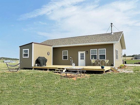 Great newer ranch style home on 8 acres West of Custer. Enjoy the view and abundant wildlife from the comfort of the 36x16 front deck. This is the spot you have been looking for, bring the RV, horses, chickens, yes, all the toys. Vaulted ceilings, with a delightful kitchen including custom counter tops, 3 bedrooms and 2 full baths. Located close to many ATV and horseback riding trails. It has the greatest fire pit ever. The master bedroom en-suite includes a full bath and great closet. Wonderful chicken barn with an extra tall fenced yard and 40x50 fenced garden area. Beside the garden is a separate basement/storm shelter, perfect storage for all the great garden produce. There is internet service and good cell coverage with AT&T. The sun-splashed living room w/ vaulted ceiling and free-standing wood stove are sure to please. There is a large amount of cut and stacked firewood, a 9x14 storage building, 450-gallon water hauling tank, playhouse and play equipment that stay with the property. The house is in Custer County located off Hwy 16 W. The roads in the subdivision are maintained via the county with a road district. The cost is built into the property taxes.