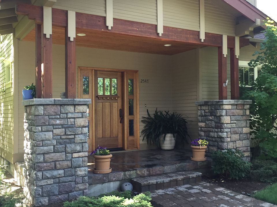 - Exterior features: Stone, Wood, Wood products, Composition