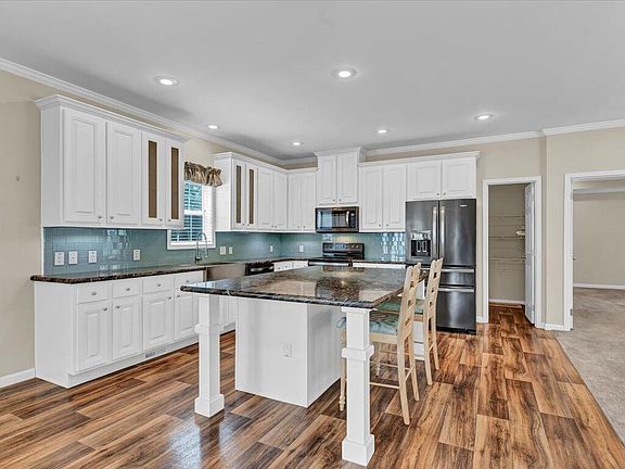Check out this meticulously maintained 2018 manufactured home that combines modern comfort with spacious living. As you step inside, you are greeted by an open floor plan that seamlessly connects the living, dining, and kitchen areas, making it perfect for entertaining and everyday living. The kitchen is a standout feature with its elegant white shaker cabinets, granite countertops, and a stylish stainless steel farmhouse sink. The island, complete with bar chair seating, provides a central hub for meals and gatherings. The kitchen is equipped with a comprehensive black appliance package, including a refrigerator, microwave, stove, and dishwasher, ensuring all your culinary needs are met. A generous walk-in pantry offers ample storage space, keeping your kitchen organized and clutter-free.