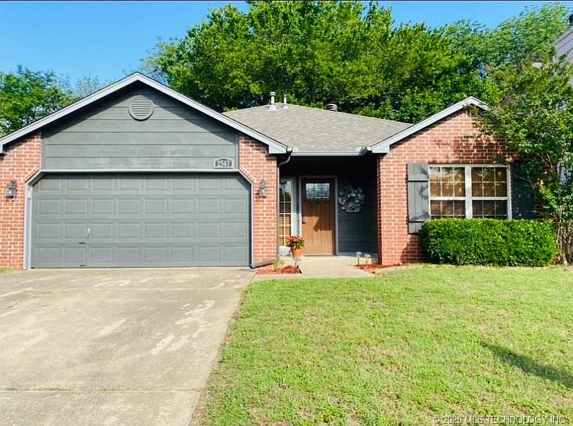 Adorable 3/2/2 with covered porch and only 1 mile from Tulsa Hills! Large living with fireplace, laminate flooring open to kitchen & dining. Large master with gorgeous Master bath, soaker tub, travertine tile shower & double sinks. Split floor plan. Updated roof, interior paint, carpet and air condenser. Smart system installed for lights and plug ins. Patio overlooking backyard with storage shed. Back to spring/creek. Close to Page Belcher Golf Course. Don't Miss this adorable home!