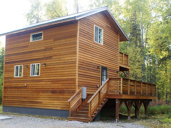 Ultra modern one year old home in a great location off Woodpecker in Talkeetna on 5 acres. 2 bd, 2 ba with full daylight lower level. Exterior finish is cedar siding with upper and lower decks. Tile flooring, recess lighting, upscale kitchen, beautiful color scheme throughout home. Very fuel efficient according to owner. Trailer/cabin is included with nice storage shed and outhouse. No restriction