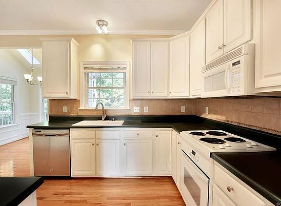 GORGEOUS light filled transitional home in turn key condition! Hardwood flooring throughout the first level, neutral colors and the open floor plan give this home a gracious flow. The kitchen offers plenty of grocery storage with the custom built double cabinet pantry. The kitchen opens to the family room and has a separate eating area overlooking a private setting. The master suite offers a large walk in closet, dressing area as well as a renovated master bathroom with tile flooring, granite counter tops, jetted tub with tile surround an inlays, and a tile and glass shower. The hall bathroom has also been updated to include tile flooring, new vanity countertop and bead board wainscoting! New carpeting throughout the second level. Additional features include a two car garage, large private backyard with fencing, two neighborhood ponds for extra room to roam, and convenience to shops and highways. Welcome home!