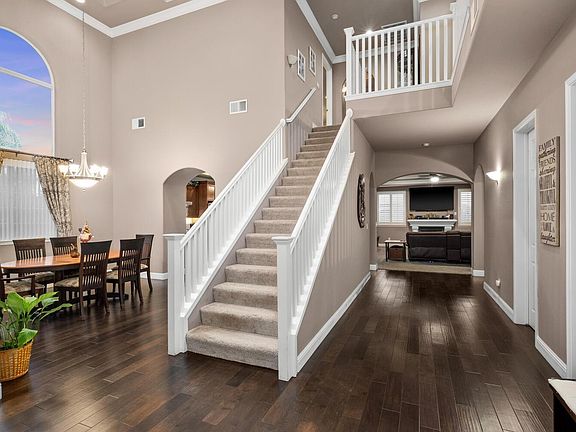 Beautiful custom built Castlebridge home in Clovis Unified School District . This home offers many amenities with 4 bedrooms/ 3.5 bathrooms, a home office, large game room, kitchen with granite countertops with an island, Alder wood cabinets, stainless steel appliances & hardwood flooring throughout the lower level, crown molding and central vacuum system. There is a work/ study counter perfect for a computer station. The master suite is on the lower level and features a double sided fireplace and sliding glass door to a private patio.The master bath has double sinks, large shower and a jetted tub. Upstairs are 3 bedrooms, the office and game room. One bedroom is extra large with a walk-in closet and a sliding glass door to a private balcony and the other 2 are connected by a Jack & Jill bath. The home is on a 12,632 +/- sized lot with large grassy area, large concreted area for entertaining, BBQ island, RV parking, 10x12 storage shed and a sparkling pool that has a large play step and a sheer dissent water feature. Perfect for entertaining your friends and family. Energy saving items are dual pane windows, 2-13 seer A/C units, whole house ceiling fan and prepaid (in-full) leased solar system. Call for an appointment today.