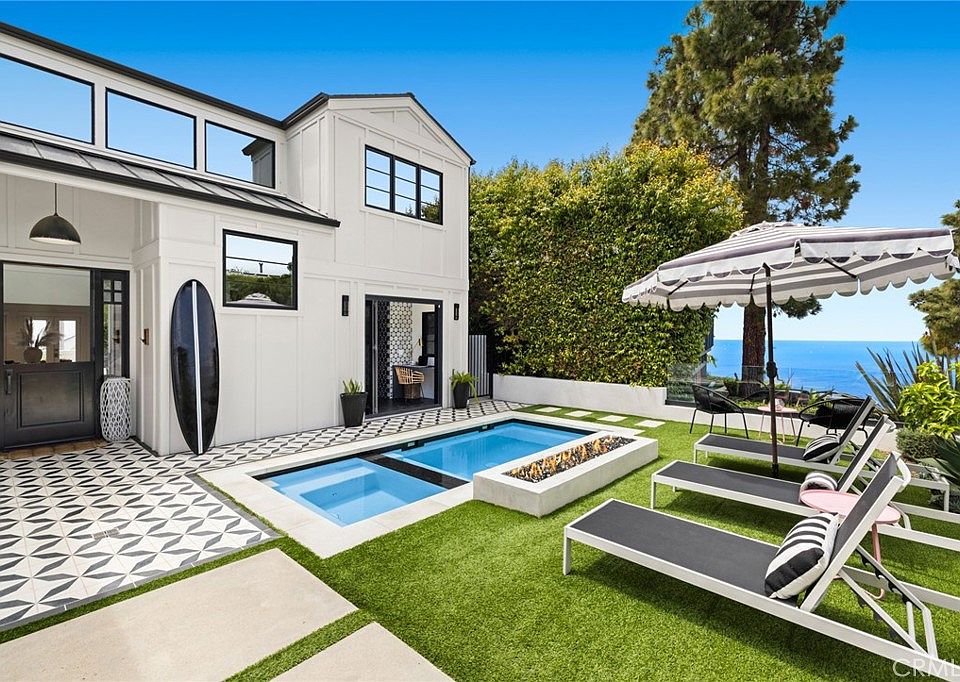 With timeless Modern Farmhouse architecture, bespoke appointments, high-end finishes and intimate ocean views, this custom home is among the finest in Laguna Beach. Completely remodeled by Anders Lasater Architects in 2020 and designed by BonitaWay Designs, the open and bright two-story residence was refreshed in 2022 and is completely turnkey today. The home’s indoor/outdoor aesthetic is apparent upon arrival at a gated front yard, where mesmerizing north-coast ocean and city-light views complement a small pool and adjoining spa, a built-in BBQ bar, open-air fireplace, gorgeous tile and lifelike turf. It’s a fitting introduction for the residence, which is appointed with designer finishes while remaining casual and welcoming. Friends and loved ones will enjoy every aspect of the four-bedroom, three- and one-half-bath design, which boasts a dedicated office with patio access. Extending approximately 2,630 square feet, the entertaining-oriented home features a dramatic entry that displays a sleek multi-tiered staircase, high ceiling, and clerestory windows for extra natural light. The main living area blends a large great room with corner fireplace, a dining area and chef’s kitchen, all of which open to a wide, sunny balcony. Every detail is perfect in the kitchen, including a spacious island with dual waterfall edges, quartz countertops and open shelving. A refreshment station presents a wet bar and beverage refrigerator, and Viking Professional appliances shine in stainless steel. Casual dining is a delight in a nook with custom built-in seating. Most bedrooms open to the outdoors, including a guest room on the main level, and a primary suite with linear fireplace, sun deck, ocean-view boutique-style closet, and a walk-in wet room. Interior touches include a dedicated laundry room, designer tilework and wall treatments, with white oak wood flooring lending warmth throughout. Board-and-batten exterior trim is crowned by a raised-seam metal roof, and the home’s fully finished four-car garage displays glass roll-up doors and a driveway with ample guest parking. In addition to scenic trails and parks, the pristine beaches, romantic coves, fabulous restaurants and famous galleries of Laguna Beach are mere moments away. Few places capture the true essence of your dreams and style like this home can ... make it yours today.