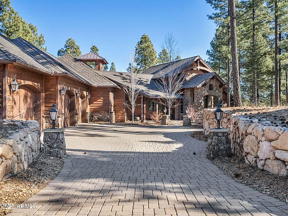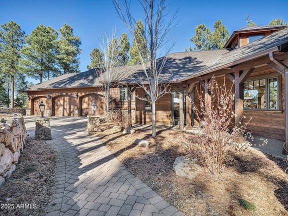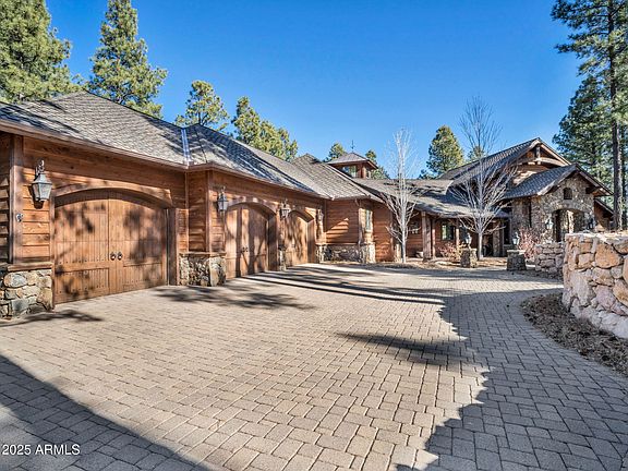 Featuring 4 bedrooms, 4.5 baths, and a large office off of the Primary suite, this masterfully designed single level floorplan sits on one of the most breathtaking lots in Northern Arizona's most premier private club - Pine Canyon, and is truly in a class of its own. At 4,652sqft this one of kind lot offers views of #18 fairway, nearby lake and mountains from the back deck. The lot, in combination with the custom architecture of the home makes this one of the most peaceful mountain getaways in the community. Upon entering the home, you are greeted by an impressive floor to ceiling stone fireplace, 2 grand chandeliers highlighting the exquisite beam work and tongue and grove ceiling, gorgeous wood flooring throughout and a custom built-in entertainment center. This open floorplan is perfect for entertaining as the kitchen, living room and dining area flow seamlessly together. Just off the living room is a chef's dream kitchen with 2 separate crescent shaped islands, a custom metal stamped ceiling, Wolf/Subzero appliances, 6 burner range with griddle and dual ovens, Scotsman ice maker, warming drawer, Miele built-in coffee and cappuccino machine, dual refrigerator drawers, full tile backsplash, and a walk-in pantry. Adjacent to the kitchen is a circular formal dining area with an elegant T&G ceiling and more beam work to support the beautiful chandelier all well a beautiful secluded climate-controlled wine cellar with custom metal door sets just steps away. Turning our focus back to the main living area, which leads to a massive covered deck with a full collapsable pocket door system, which is perfect for Flagstaff's desired indoor/outdoor living. Take in the magnificent views from the back deck which also features a floor to ceiling stone fireplace a custom live edge wood mantal, built-in BBQ, and oversized dog run. The primary suite has its own private balcony with a porch swing overlooking the golf course, and boasts one of the most luxurious baths complete with a large tiled walkthrough steam shower, separate his and her vanities, makeup vanity, copper soaking tub, two walk-in closets (one with an additional laundry room), and even his/her separate toilets including a urinal. On the opposite end of the home there are 3 additional en-suite bedrooms, one with it's on private balcony, and even a fully automated theater room. The state-of-the-art home theater includes comfy leather power recliners with seating for 8, a sound system that rivals large movie theatres equipped with 13 speakers allowing for 2,500 watts of sound, a 140" ultra-high-definition projection system, custom designed acoustic treatments, hand crafted wood paneling, and custom lighting all of which complete the most ultimate cinema experience in your very own home. Additional features include, but not limited to, an epoxied 3-car garage with cabinets and a separate workspace, surround sound throughout and Control4 smart home system which gives the owner the ability to control the homes lighting, sound, security and comfort from one location as well as set their own unique moods whether daytime, nighttime or entertainment settings. This home is being sold with almost all the furnishings, and is move in ready. This is the ultimate tranquil mountain retreat.