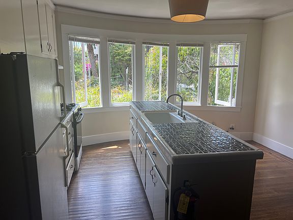 This charming 2 bedroom home is located in triplex at the corner of Parker Ellsworth Street, in the center of Berkeley and is close to campus, BART, and shopping. Hardwood floors and wood windows run throughout this easy floor plan which is ideal for working from home or being on the go. The light and airy kitchen is flooded with natural light from the beautiful bay windows. The kitchen is equipped with gas stove, frig, and beautiful mosaic ceramic counter tops with plenty of cabinetry. Redwood fence is in process of going up to create a private patio area. This bright and sunny home is in excellent condition and is available to rent starting mid-late July 2025. Security is equal to 1 month's rent. This is a smoke, and animal free home. Laundry is just 2 short blocks up on the corner of Parker and Telegraph. Owner pays water and garbage. This is a 1 year lease which goes month to month after lease end.
