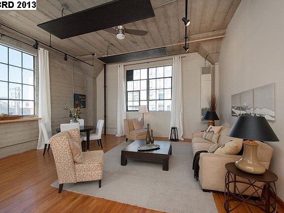 Gleaming oak floors and the dramatic scale of 13ft ceilings, oversized industrial windows and concrete pillars create a warm but edgy vibe in this hip Jack London Square warehouse loft. Stroll to foodie hot spots, the waterfront, theaters and night life. Close to BART, Amtrak, SF Ferry, freeways. Walkscore 92!!!