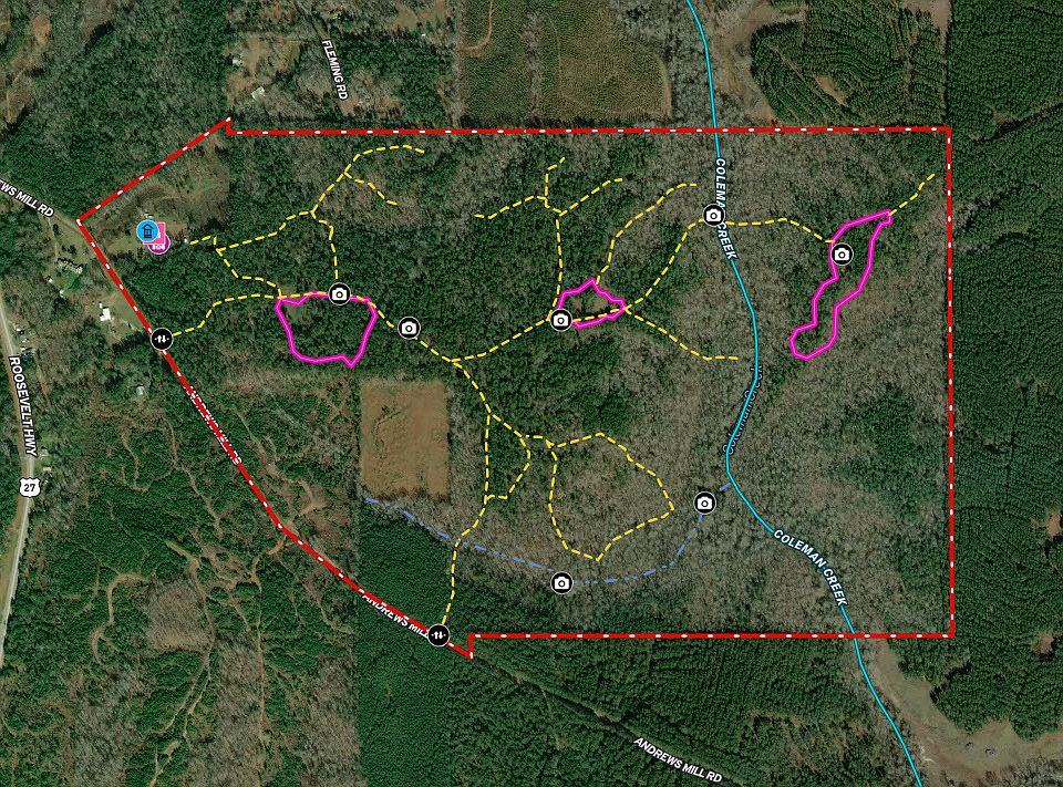 The Posey Farm is a well-maintained outdoor paradise in Northern Meriwether County. The farm has been carefully managed for Wildlife. The Food plots are positioned around the property to create maximum hunting opportunities and wildlife habitat. The food plots consist of Four large fields and numerous small hunting fields. They are all planted in seasonal plant mixes, to create the best possible nutrition and desirability for wildlife. The interior road system covers the entire property with main roads and trails that all connect for complete tract access. The timber is a great mix of Mature Pine and Huge Hardwoods. The Hardwoods are superior with large areas of Both Bottomland and Upland trees. In todayas Pine Plantation world, large areas of mature Hardwoods really do not exist, and the Posey Farm boasts over 150 acres of Beautiful Hardwoods! Coleman Creek, flows through the property, it is a bold flowing year-round water, that creates unbelievable views and top-notch Wildlife habitat. A small secondary creek flows into Coleman Creek and has the potential for a future lake site. The Cabin is a well-kept 3/2, with a nice back porch overlooking a fenced backyard. Several barns are perfect for storage and livestock. The North Meriwether location is very convenient to Interstate 85, shopping, but yet rural enough to get a way form the hustle of everyday life. The Posey Farm, Checks all the boxes as the Perfect Hunting / Recreational property for the whole family.