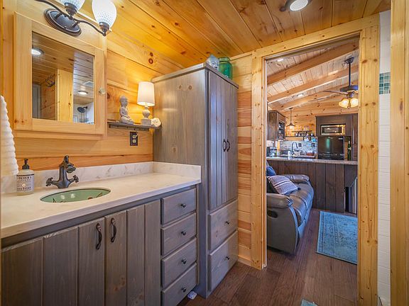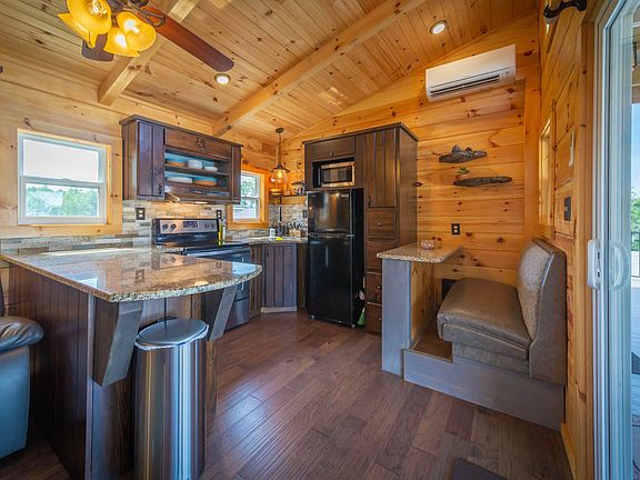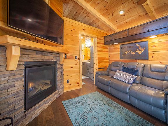 1 BR, 1 full BA park model log home. This cabin is located on Site# 3 in Black Bear Bluffs at beautiful Lake James. This cabin is designed for efficiency in a compact space. Open living room with vaulted ceilings and a stone gas log fireplace. The kitchen has high-efficiency appliances, granite counter tops, on demand hot water and custom cabinets. The master BR has built-in cabinets with stackable washer & dryer and beautiful views of Dobson Knob out the double glass door. The BA has a large walk-in tile shower, toilet area, and a beautiful handcrafted ceramic sink in the lavatory. Just outside the main living quarters is a 10'x12' separate unheated living area that's currently used as a spare BR. Outside this home is a covered 12' x 63' wrap around Trex deck with decorative stone pillars around the support post. On top of the home is a rooftop balcony.