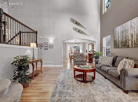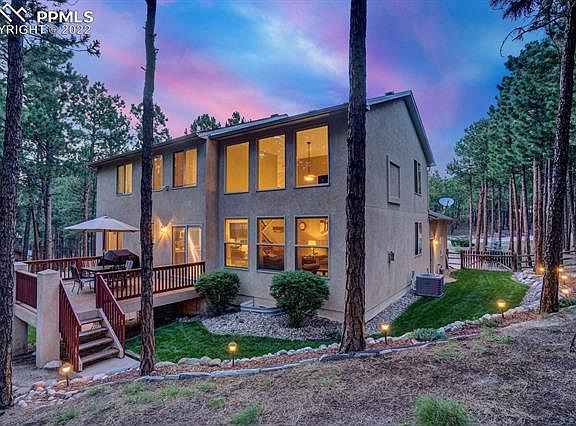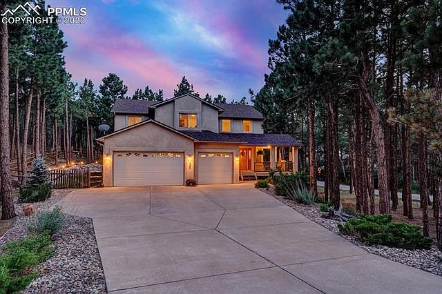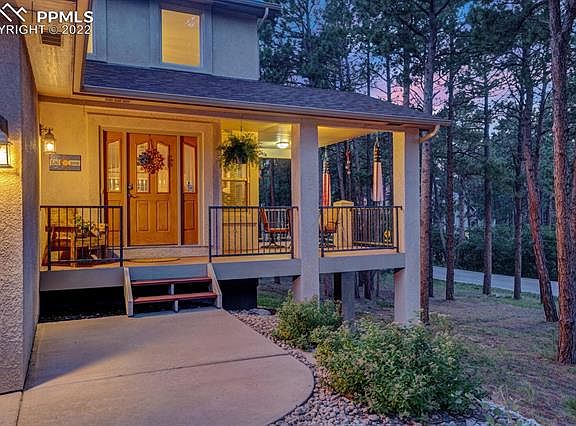 Picture yourself living on this quiet, treed corner lot on a lovely cul-de-sac in desirable Woodmoor. This home is truly made for both entertaining and everyday living, with plenty of space and fabulous natural light. Enjoy an open floor plan, high ceilings, and a chefs kitchen with stainless steel appliances, plenty of cabinets, gorgeous updated granite countertops and a roomy pantry. Enjoy your favorite beverage on the wrap-around porch or extended rear deck with beautiful views. This stunning custom home by Larry Nichols is genuinely a classic masterpiece with quality design elements throughout. The artful pass-through arch into the formal dining room and reverse tray ceiling in the kitchen highlight the attention to detail in this beautiful home with a gorgeous warm yet modern palette. This home has been lovingly maintained and thoughtfully updated throughout. To name a few fabulous updates/upgrades: *Updated Kitchen *Updated and stunning primary bath *Extended and fresh hardwood flooring on the main level and new carpet throughout * Fresh interior paint * Newer Furnace, Water Heather and New A/C * Class IV Roof in 2019 * Fire mitigation on all trees is completed. Woodmoor has numerous bridle trails, a 1919 updated barn used as a community center, and two ponds. Only minutes to I-25, shopping, dining, recreation, and I-25 access. Be sure to grab this beautiful piece of Colorado!