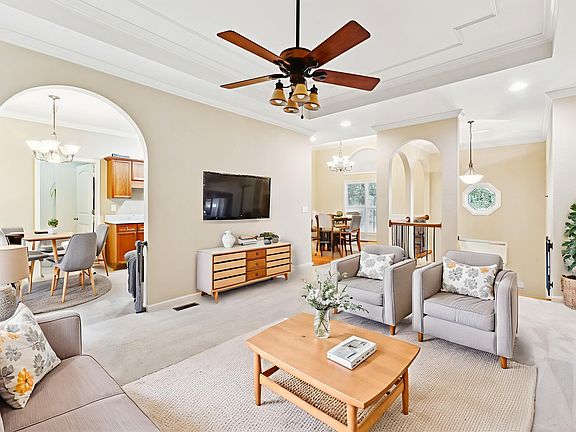 Welcome home to your 3-bed, 2-bath open floor plan. This home features tall and tray ceilings, crown molding, and stunning archways. Hardwoods in dining, ceramic tile in baths, plantation blinds, and a master suite with jetted tub, double vanity, and huge walk-in closet. Relax on the covered back deck, watching deer roam your 1.3-acre lot—perfect for young buyers craving nature! You could even bow hunt off the porch! No HOA, no neighbors behind, and a partially finished basement with a movie room and bonus space for future expansion. In the backyard you will also find a building for extra storage or a workshop. Schedule your private tour today!