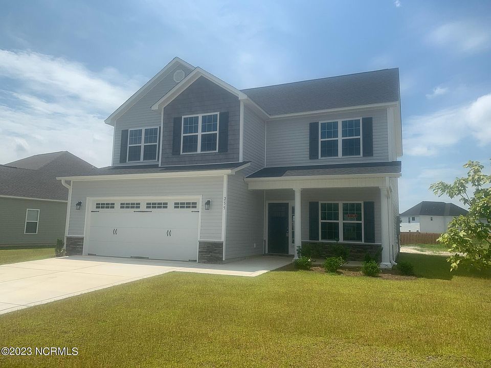 Welcome to the highly desired & popular community of Onslow Bay. Brand new construction built by Onslow County's most trusted & preferred builder, featured in Builder 100/ Top 200 Builders in the country. Onslow Bay is a hot spot, 3 miles to MCB Camp Lejeune's Piney Green gate, 14 miles to New River Air Station & minutes to area schools, shopping & dining. This beautiful neighborhood is sure to impress, complete with a clubhouse area & community pool. The Grayson floor plan: 4 bedrooms and 2.5 bathrooms at approximately 2381 heated square feet. The exterior has easy-to-maintain vinyl siding, accented by stone or brick. The covered front porch is surrounded by sodded front yard with clean, classic landscape. The foyer welcomes you into large family room, approximately 16' x 20' with electric fireplace, surrounded by marble and topped with a custom mantle and ceiling fan. The chef in the family is sure to fall in love with the kitchen! Flat panel, staggered cabinets and an island. Stainless steel appliances include smooth-top range, microwave hood, and dishwasher. Enjoy morning coffee in the breakfast nook. All bedrooms are found upstairs. The master suite is sure to impress. Approximately 15'x18', master suite features a ceiling fan and dual walk-in-closets. ''Get away from it all'' in the luxurious master bathroom! Double vanity topped with cultured marble counter, full view custom mirror, tile flooring, separate shower, and soaking tub. Bedrooms 2, 3, and 4 are perfectly sized with walk-in closet and prewired for ceiling fans. Separate laundry room and mud room. Two car garage. Entertain guests, or just relax, on the back covered porch. Backed by one-year builder warranty from top, local builder. $10,000 USE AS YOU CHOOSE!!! NOTE: Floor plan renderings are similar and solely representational. Measurements, elevations, and specs may vary in final construction. Limited selections for buyer to choose. Call L/A to verify.