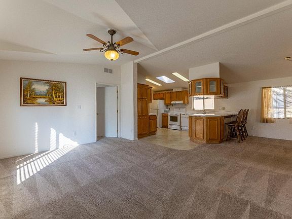 The open floor plan features a large living room. The kitchen boasts a breakfast bar, and a separate dining area, making it easy to cook and entertain.This home features a primary suite with a walk-in shower and closet. The laundry room is conveniently located off the kitchen, and there is plenty of storage throughout the home. This double wide mobile home is conveniently located just minutes from shopping, dining, and entertainment, and is a must-see for anyone looking for a spacious and comfortable home.