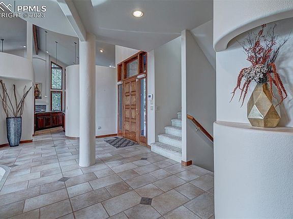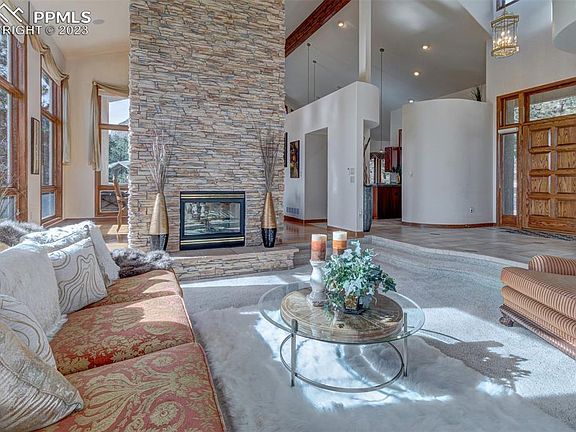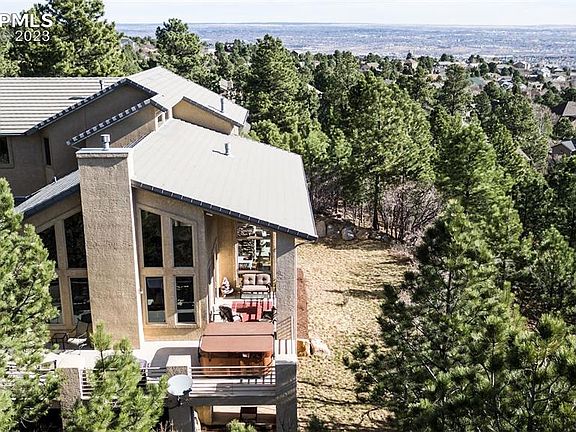 Custom home in the Broadmoor Spires. Located on a premier .69 acre lot that borders a preservation area w/mountain & city views. This beautifully maintained home boasts a stunningly open floor plan w/contemporary ambiance. Built by Carl Branan w/exceptional quality & attention to detail: Stucco exterior, Concrete tiled roof, Hardwood & tiled Floors, Wrap-around view deck w/covered area, 5 Gas Fireplaces (one double-sided), Vaulted Ceilings w/wood beams, Pella Windows for amazing natural light, great design w/lots of architectural interest. 4 Bedrooms plus a main level office (or main level bedroom). Living room hosts a wall of windows w/city views & an impressive floor-to-ceiling stacked stone fireplace. Fireplace is two-sided & also opens to dining room which also offers hardwood floors & a chandelier. The well-designed kitchen opens to a casual dining area & a cozy family room. This entire area has tiled floors. The dining area features a bay of windows w/fantastic mountain views & direct access to the wrap-around deck. The family room offers a fireplace & deck access. The kitchen features granite tiled countertops, cherry cabinetry, stainless steel appliances, a center isle w/5-burner Thermador gas cooktop, double ovens and and a large island w/counter seating. The entire upper level is reserved for the luxurious master suite which offers a corner gas fireplace, peaked ceiling & double doors that lead to the sumptuous master bath featuring a glass block circular shower, tiled floors, raised dual Cherrywood vanities & jetted tub. A carpeted exercise area & 2 walk-in closets complete the master suite. The walk-out lower level has 9’ to 10’ ceilings and features a large rec room. Spacious main level laundry room w/tiled floor, double broom closet & sink. 3-car garage. Forced air heat w/3 zones. Central Air. 2 Hot Water Heaters. 20 Tesla solar panels feed a Tesla wall yielding low electric bills & transferable electric credits. For other inclusions-see extras!