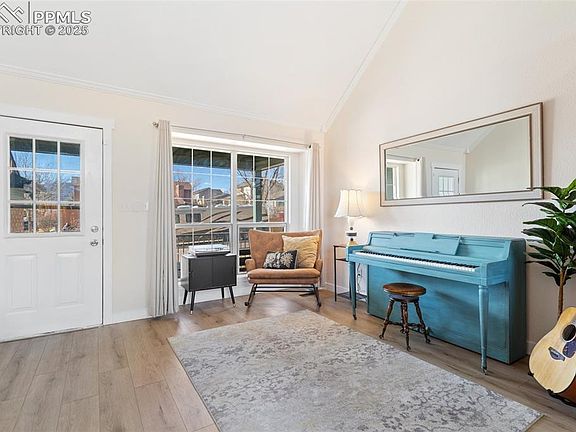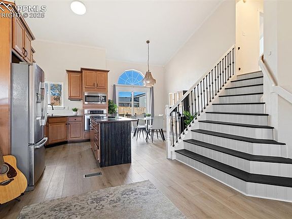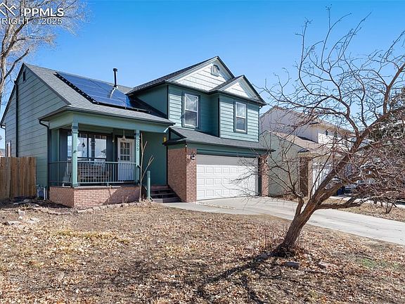 Beautiful home with a great floor plan layout. Covered front porch with a view of Pikes Peak. Very large kitchen/dining area, very open and has great natural light! Kitchen also has granite countertops, island, and stainless steel appliances. Living Room has a gas fireplace to cozy up to on cold winter nights. Upstairs has three bedrooms/2 baths, to include a master suite with walk in closet and bay window/sitting area. Master bath has double vanity sinks. The basement level contains a large extra room that can be used as a media room, extra family room, or unconventional 4th bedroom. Bathroom at basement level as well with a 3/4 bath. Spacious laundry room! Privacy fenced back yard and extra large deck makes this home great for entertaining! In the summer months you can opt in to a membership to an association pool very nearby. New Roof October 2023, Class 4 Composite Shingle, newer water heater and furnace.