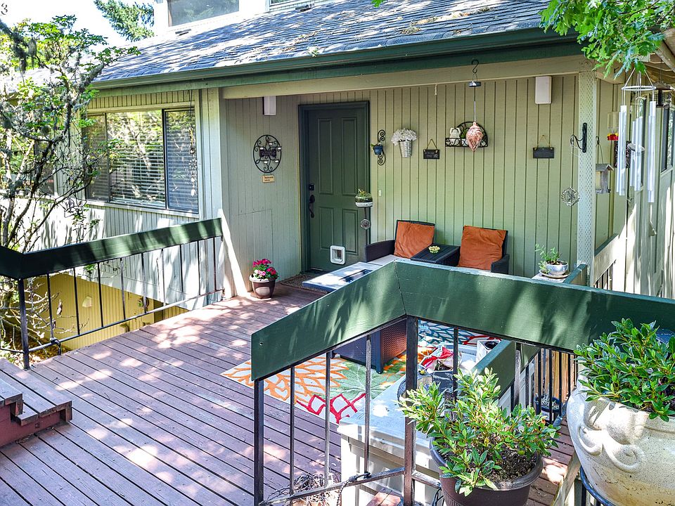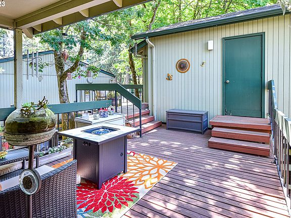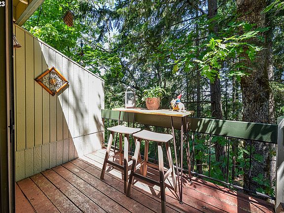 Fantastic South Eugene townhome tucked in the trees. This is a much desired corner unit with a 2 car garage that is oversized. New roof in 2021, Open concept living area with lots of stylish updates. Living area with vaulted ceilings and extra upper windows gives great natural light throughout. Beautiful feature wall with wood and a cozy fireplace. Sliders take you out to a nice sized balcony perfect for grilling and chilling. Kitchen with nice finishes, open to the dining space along with a breakfast bar and seating. Laundry room with storage. Primary bedroom with en-suite, generous walk-in-closet and your very own balcony. Take advantage of onsite amenities like the pool and weight room. This location offers several great parks, endless trails to explore, shopping, great local eateries and so much more. Such an amazing opportunity!!