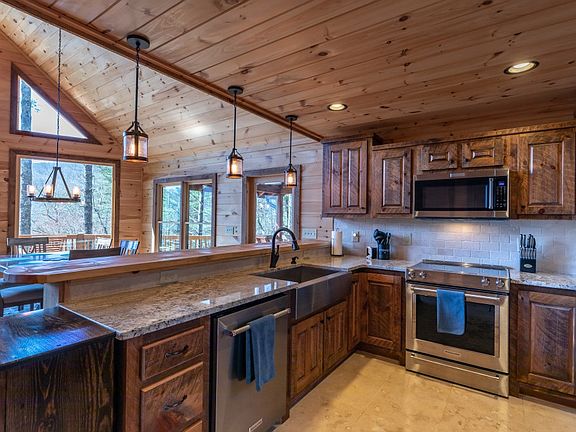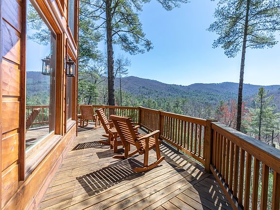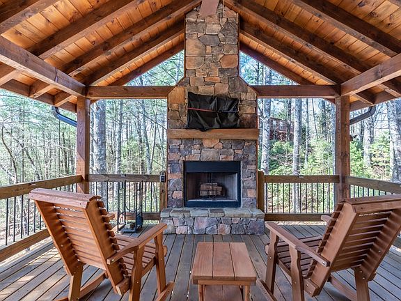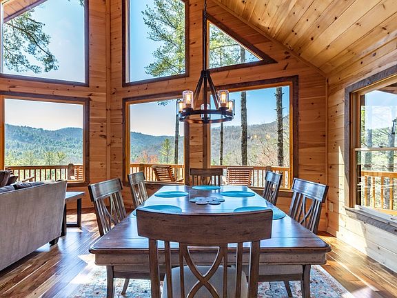 Towards the end of a dead-end street, comfortably nestled among the towering evergreen trees sits this magnificent, 3-story mountain chalet. Long-range mountain views delight viewers from the 2-story windows of the LR and one of the 3 covered decks. Wood floors, T&G walls & ceilings, & custom cabs add to the cabin feel of this cozy getaway. The open-concept LR/DR/Kitch includes a stacked stone FP w/ hand carved mantle and wraparound deck & covered deck access. Huge main floor primary suite w/ private deck access & oversized en suite that includes a dbl sink vanity w/ hand-carved wood c-top, jetted tub, & step-in shower. Lg terrace bonus rm w/ FP, wraparound deck, wet bar w/ wine fridge, & lg BR w/ ensuite. Upstairs has Jack & Jill BRs plus loft desk space. Other features: granite c'tops, S/S appliances, solid wood doors w/ blk hardware, hot tub, ceiling fans, & loads of windows.