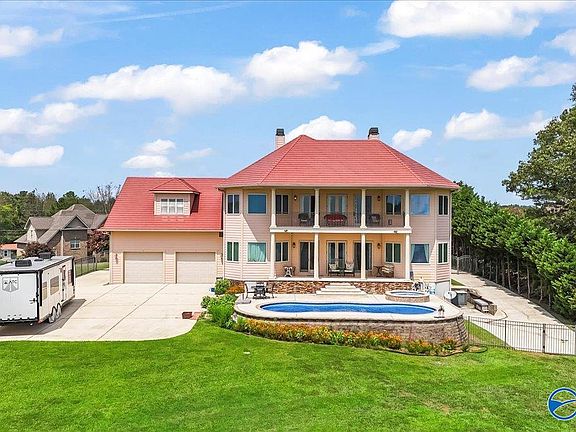 Soak in sweeping bluff views of Lake Guntersville & the mountains while relaxing by your private in-ground pool, on the spacious back porch, or deck above. This custom-built home is loaded with luxury touches—2 master suites, a chef’s kitchen with island, walk-in pantry, breakfast nook & custom cabinetry, plus formal dining and a dedicated office. A 2nd family room with wet bar & fireplace offers the perfect retreat. Elevator, 4-car garage, insulated basement, whole-home generator & travertine tile complete this one-of-a-kind property!
