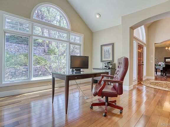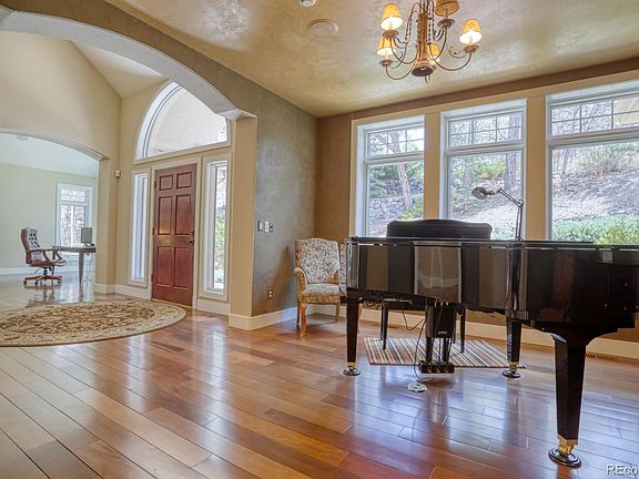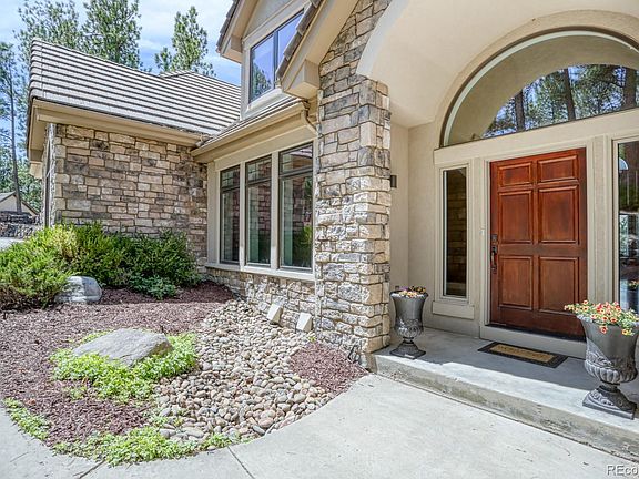Natural beauty surrounds this spacious custom home at the end of a quiet cul-de-sac on a large 0.7 acre wooded lot. View elevated landscaping in the front from the office or dining room and mature trees and mountain ranges in the back from the family room picture window. The main floor features a formal living room and dining room, vaulted family room with gas fireplace, and large laundry room. Spoil yourself with the main floor master bedroom with vaulted ceilings, gas fireplace, 1,250 square foot deck access, two large walk-in closets, and an adjoining 5-piece bathroom. The main floor, upstairs, and stairways boast new Brazilian walnut hardwood floors. The spacious, updated kitchen features a large central island, all new cabinetry, granite counters, accent lighting, custom hood, and walk-in pantry. The new appliances include a Sub-Zero refrigerator, Thermador dual fuel double oven range, and built-in drawer microwave. Spoil your guests and dependents with 3 spacious bedrooms and 2 baths upstairs. The full finished walkout basement has 2 bedrooms with private ensuite bathrooms, den/office area, and a second laundry. The finished basement also features a spacious great room with a wet bar, and a fully enclosed home theater with 144' projection screen. Enjoy the surrounding beauty and nature on the large deck or the covered patio below. You will love the privacy with natural barriers separating neighboring properties and backing to community property. There is ample parking with the oversized 3 car garage and expanded driveway. Castle Pines Village amenities include: gated community, 24 hour on-site security, fitness center, 3 community pools, tennis and pickleball courts, and community events. Community trails are accessible just beyond the back yard.