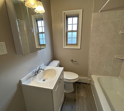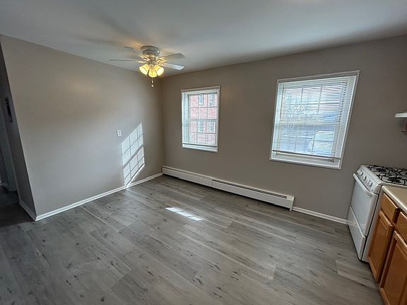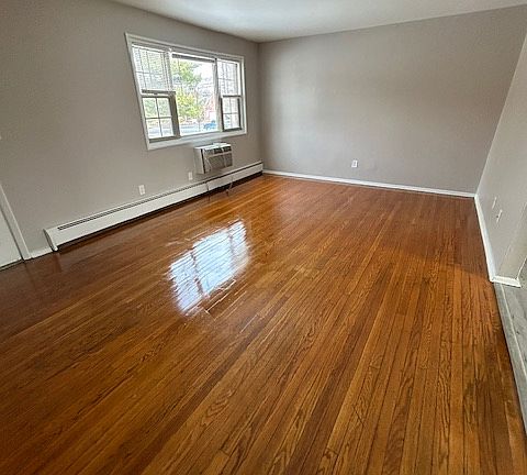 Immaculate first floor apartment with large eat in kitchen (includes stove, fridge, dishwasher and microwave), large living room, 2 bedrooms and updated bathroom. Close to NYC trans, restaurants, shopping, park and much more. Freshly painted and re finished hardwood floors. Heat and hot water included. One year lease. Heat and hot water included. Dogs under 30 pounds and cats allowed with a $250 non refundable pet security and additional monthly rent of $25 for cats and $50 for dogs. Off street parking included.