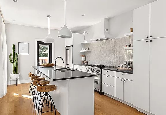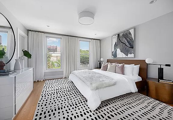 Pristine Townhouse. Private Outdoor Space. Prime Williamsburg. Introducing this gut-renovated single-family townhouse on a quiet stretch of Manhattan Avenue, a luxurious 5-bedroom, 3.5-bathroom home that exemplifies modern craftsmanship and design. Beneath a charming blue façade, the home spreads 2,700 sq. ft. of immaculate interior space across three floors and a finished cellar. High-grade Mitsubishi split-system units provide heating and cooling throughout. Brand new sash windows, beautiful wide plank oak floors, and chic light fixtures punctuate spacious rooms and living areas. All closets are fully customized with built-in storage solutions. The parlor level of the home contains a floor-through living room, dining room, and kitchen saturated with eastern and western light. The kitchen is equipped with a huge eat-in island, sleek Caesarstone countertops, an Italian herringbone backsplash, custom cabinets, and a suite of high-end stainless steel appliances from Kitchen Aid and Bertazzoni. Just off the kitchen is a lovely deck with a grill and access to a backyard with a privacy fence, outdoor furniture and lush planters. A convenient powder room and laundry closet with an Electrolux washer/dryer finish the parlor level. A gorgeous staircase with modern railings leads up to three bedrooms and two full bathrooms. The primary bedroom overlooks Manhattan Avenue and has a large closet and a windowed en-suite bathroom with a floating double vanity, radiant heated floors, and a walk-in stall shower. The second and third bedrooms have private closet space and share access to a second bathroom with a floating vanity, radiant heated floors, and a deep soaking tub. The garden level of the home contains a pair of bedrooms, a full bathroom, several closets, and a large recreation room. With a separate entrance and direct access to the backyard, there is ample opportunity to create a separate guest or rental unit. 255 Manhattan Avenue is ideally situated in the heart of Williamsburg. It is moments from dozens of restaurants, bars, cafes, and shops, and it is a few blocks from the L trains stations on Graham Avenue and Lorimer Street. McCarren, Cooper, and Sternberg Parks are also close by.