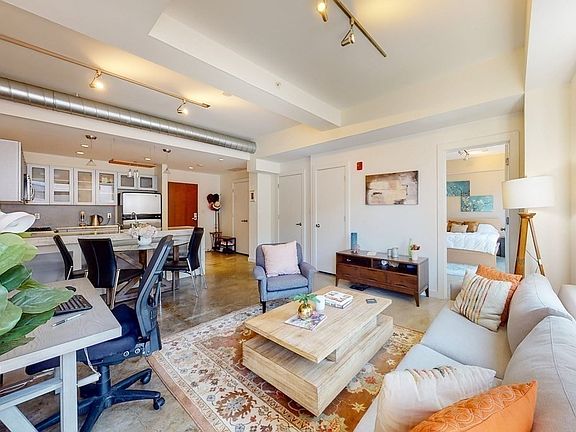 Stylish 2 bedroom unit at The Modern, a professionally managed elevator building. You are welcomed by 10 ft. ceilings and beautiful light streaming through the floor-to-ceiling windows into the open living/dining area. The jewel tone concrete floors are just a few of the characteristics in this lofty space. Cooks kitchen with gas cooking, large granite waterfall island and bar seating. Enjoy morning coffee on your private balcony. Huge primary bedroom with oversized walk-in closet as big as some bedrooms. 2nd bedroom is ideal for guests or home office. Delightful bath with soaking tub. Laundry in unit & Central AC. All topped off by a magnificent common roof deck with stylish furniture, gas grills, sinks, a full bathroom and amazing city views. Building is cleaned every day. This convenient location has great access to public transportation, Northeastern University & major highways. And right around the corner is Mida, SRV and many of the other attractions of the bustling South End.