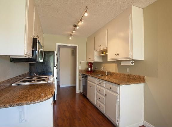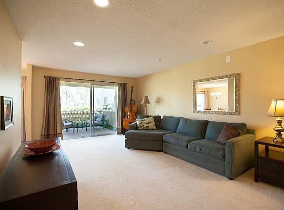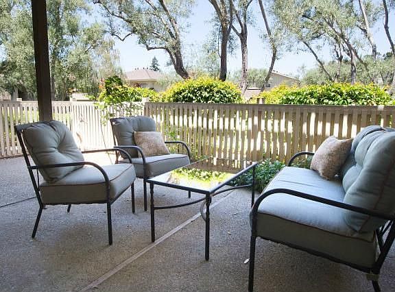 Quiet end-unit location, this 2 bedroom/2 bath condo offers stylish remodeled bathrooms and updated kitchen. Spacious living room opens to large shaded patio overlooking greenbelt. Unit offers recessed lighting, granite counters, carpeting in living areas, and master bedroom suite.