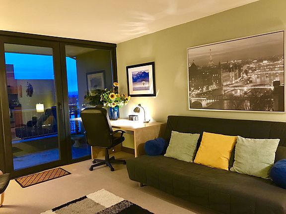 AVAILABLE April 23, 2017, 1 MONTH LEASE Located in DOWNTOWN PORTLAND. Close to PSU/ OHSU . Beautifully FURNISHED 1 BR 1BA 600 SF condo is a gem, providing all the comforts of home. Enjoy amazing views of the river and the city from its large balcony. Conveniently located to South Waterfront , PSU, OHSU, the riverfront and other downtown businesses. Jump on the streetcar to go enjoy the Pearl District, NW 23rd or get on the max to the airport. Features luxury finishes including stainless appliances, granite countertops, kitchen island, wood flooring . Enjoy your favorite movies or shows on the smart TV . Floor-to-ceiling windows provide abundant natural light and access to a large covered balcony perfect for entertaining, alfresco dining and relaxing as you soak in the amazing views. Building amenities - year round sauna/spa, outdoor DBQ area with fireplace , secure building access, covered / free laundry facilities and beautifully landscaped grounds. Rental terms: 1 mo lease for 1700/ mo. Rent includes Internet/water/sewer/garbage/parking/storage and laundry. Tenant pays electric. $ 500 security deposit, refundable. Application fee $50 nonrefundable Owner pays for internet , water , sewer , garbage, onsite laundry, secure covered parking . Tenant pays for electric . Minimum credit score 640