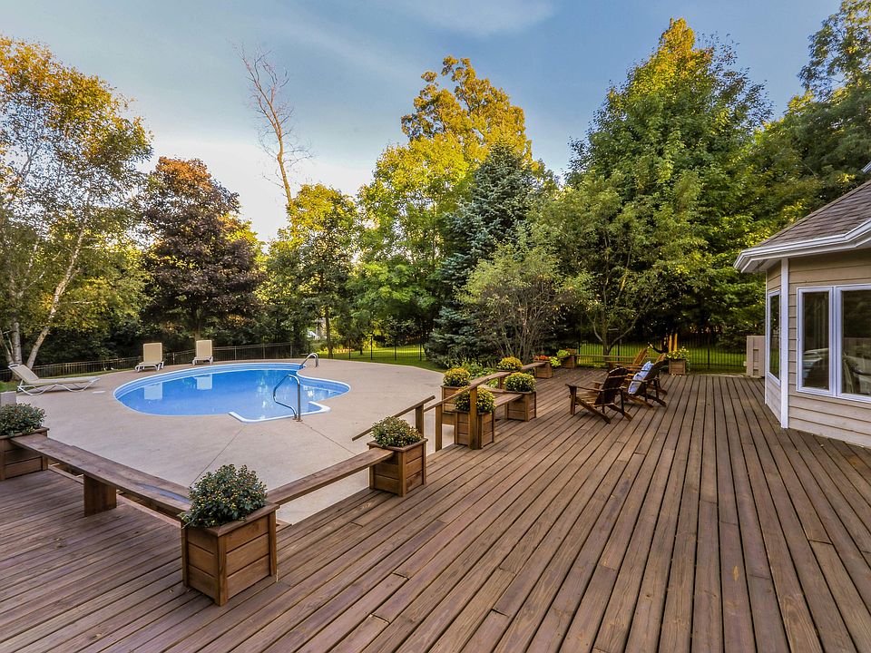Spacious 4 bedroom home has 2 full/2 half baths, main fl owners' suite, 3 car garage and an in-ground pool with pool house. Located in an established Williams Bay neighborhood within walking distance of the lake, beach and restaurants. Owners' suite has a pass-through library, adjacent den or office, steam shower and walk in closet. Large kitchen features a hearth area w/double sided fireplace, granite counters and a dining nook overlooking the backyard. Second floor boasts 3 bedrooms, a full bath and a bonus room. The finished lower level has a large wet bar and plenty of space for entertaining. the fenced yard feels perfectly private. New furnace/AC, interior paint and carpeting throughout. Lovely lot with mature trees.
