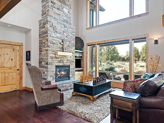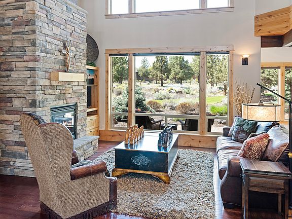Stunning Eagle Crest home in immaculate condition backing to ponds, walking paths and peaceful common area! You can sense the quality and care put into this home from the moment you walk inside! Features included, high vaulted ceilings, expansive windows with excellent natural lighting, upgraded floor to ceiling dry stack rock fireplace, wood ceiling with exposed beams, wood wrapped windows and solid wood doors, stainless steel appliances and granite countertops, matching upper level covered decks, main level primary suite with coffered ceilings, cozy gas fireplace, accent lighting and private deck entrance, gorgeous hardwood floors, loft area and a large bonus room. HOA includes front and back yard lawn care and landscaping, and the home can be used as a short term rental. Don't miss all that Eagle Crest has to offer such as pools, golf, tennis courts, pickleball, sport courts, hiking and biking trails, equestrian, walking paths and access to the renowned Deschutes River!