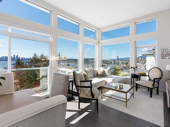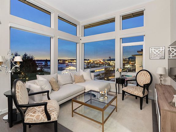 Stunning views from this designer 2 bed / 2 bath SW corner home in Polygon's West Quay. 1,070 sf of living space w/ over height 11ft ceilings & expansive floor to ceiling windows providing natural light & unobstructed views of Burrard Inlet & downtown. City lights twinkle at night. Updated with new paint, updated lighting w/ dimmers throughout, "Perfect Sunset Shades" w/ automated black out blinds by MaxxMar, new wine fridge/bar, security & designer touches throughout. Chef's kitchen equipped with premium SS appliances & sleek cabinetry. Primary bedroom enjoys views to downtown w/ WIC and spa like ensuite w/ double sinks, soaker tub, and walk-in shower. Easy living at West Quay w/ gym, social lounge, 1 secure parking/storage & steps to restaurants, cafes, parks, shopping and transit.