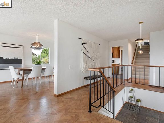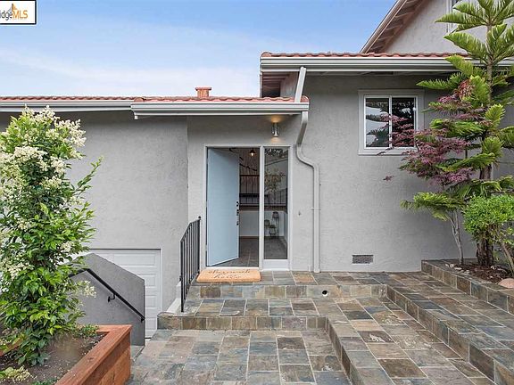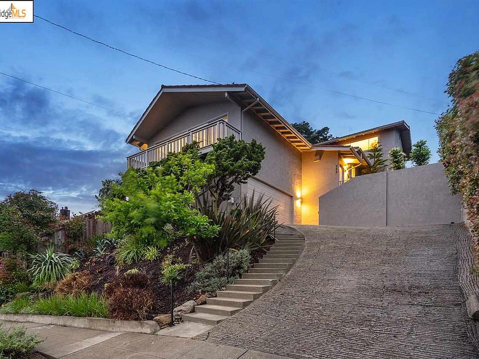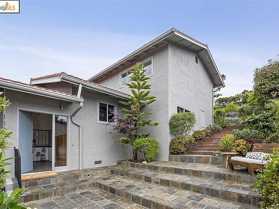 This mid-century marvel sits above the clouds in Kensington and boasts PANORAMIC VIEWS of the Bay. Classic herringbone wood floors line the living space beaming with natural light. Sliding glass doors allow access to the deck which is a prime spot to stare at SF and the Bay. This home has a great flow - the living/dining areas open into the remodeled kitchen. Beautiful tile work on the floors and backsplash, stainless steel appliances, Calacatta Quartz countertops were all added as part of the kitchen enhancement. Off the kitchen is a bonus space that makes a great office space/playroom. Up the staircase you will find three bedrooms and two bathrooms. The master suite features an ensuite bathroom and more VIEWS! Guest room allows access to the INCREDIBLE backyard oasis. Yards like these are tough to find! Privacy, views, fruit trees - this one has it ALL! Perfectly located near Kensington's coveted schools. A rare find not to be missed!!