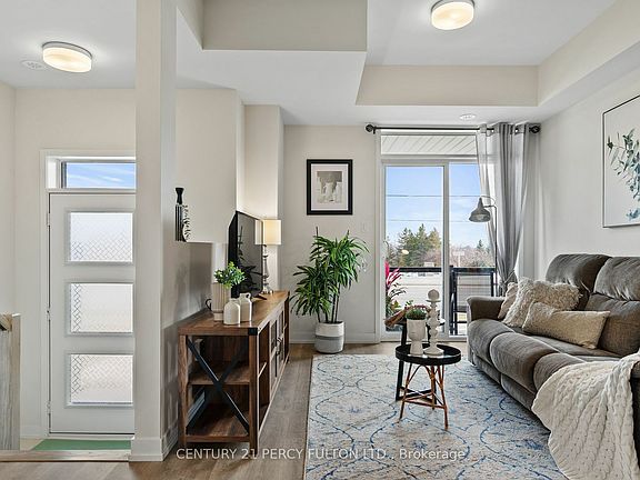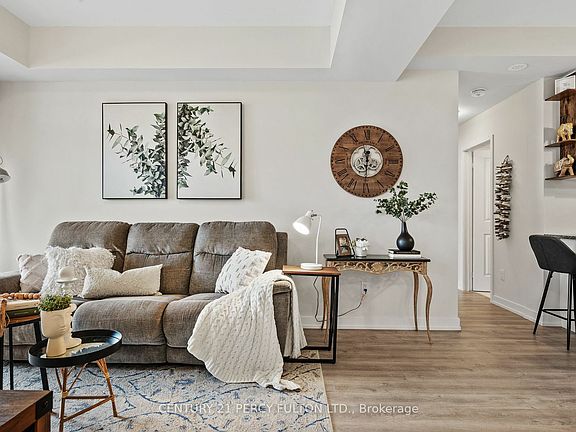 Enhance your lifestyle with this 1-story townhome in Duffin Heights. Ideal for professionals, first-time buyers, retirees, and singles. This stunning townhome offers 2 beds, 2 baths, 2 parking spots, 2 entrances, and a classic entryway with ample closet space. Enjoy 9ft ceilings and a stylish kitchen with abundant storage and a breakfast bar. Upgraded light fixtures add allure. The primary bedroom features a spa-like ensuite with a shower seat and a custom upgrade double sink, plus a rare customized walk-in closet making great use of space. Your own garage with direct access and electric car rough-in. Step onto the expansive balcony for outdoor relaxation. Low maintenance living at its finest. Conveniently located near transit, major highways 401/407, GO, shopping, schools, daycare, parks, and more.