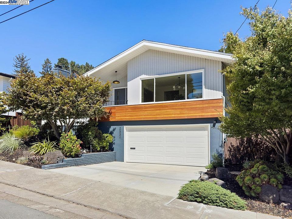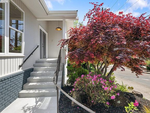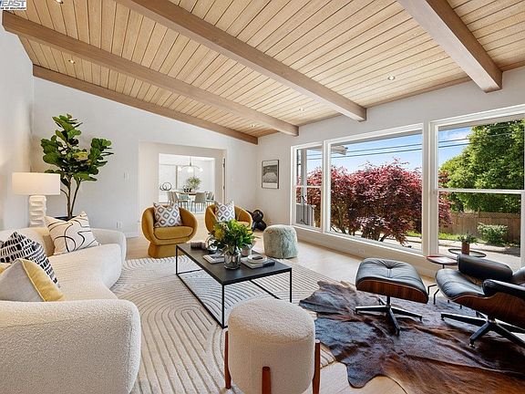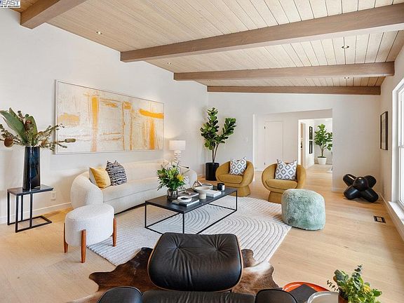 Renovated Mid-Century modern home in Lincoln Highlands offers a masterful blend of classic architecture & luxury. Designed for versatility & comfort. 3 bedrooms plus + 3 full baths on the main level. Formal living room featuring dramatic beamed ceilings & linear framed electric fireplace. Expansive spaces w/ elegant comfort, highlighted by stunning views of the San Francisco Bay from the formal dining room. A chef’s kitchen w/ smart appliances & an island opens to a media room, leading out to a deck that promotes an effortless indoor-outdoor lifestyle. The lower level includes a versatile rumpus room that can be used as a 4th bedroom/office w/ a full bath, plus interior access to a 2-car garage. Engineered hardwood floors, spa-like bathrooms w/ designer tiles & fixtures, & a freshly enhanced backyard & deck perfect for entertainment. Many new windows, recessed lighting, plumbing & electrical updates, new skylight, new roof, new furnace & water heater, & digital entry locks. Close to the acclaimed Head Royce School, parks, East Bay hotspots, and highways 13 & 580.