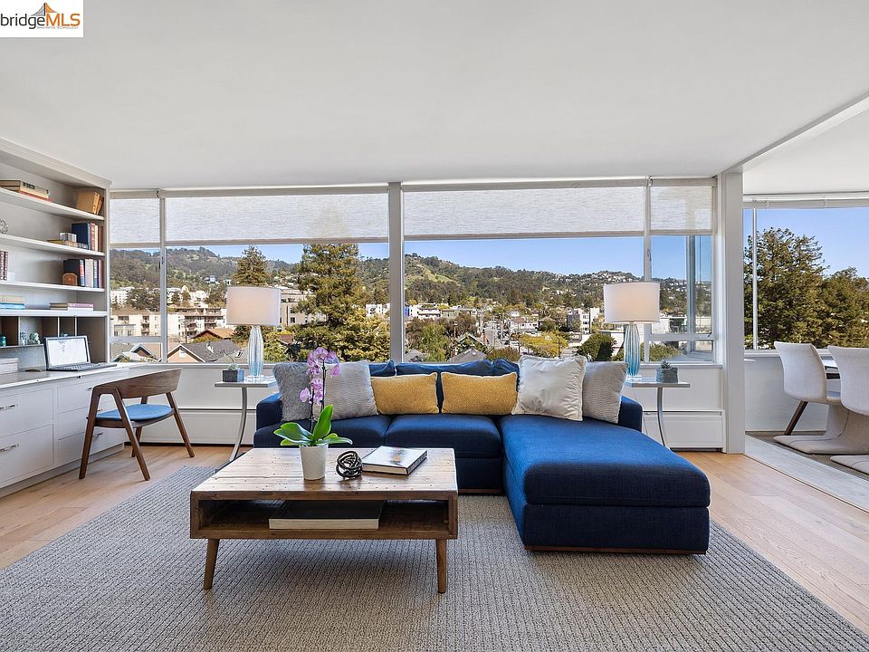 Sophisticated and stunning1 bedroom unit in Berkeley Town House, a well-established senior (55 years+) housing cooperative in a perfect Central Berkeley location. Great value for seniors in East Bay. Level-in, secure building. Panoramic views of the East Bay hills from a wall of east facing windows. Open remodeled kitchen/living room with newer built-ins and cabinetry. No refrigerator in kitchen. Enclosed lanai. Wood floors. Recently remodeled ground floor common areas. Convenient to shopping, university activities, cultural events, recreation, restaurants and public transportation.
