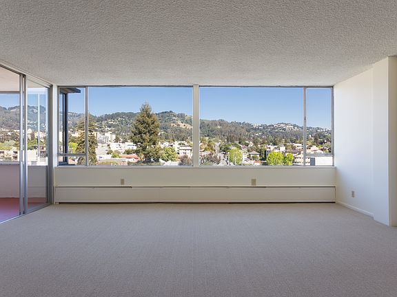 Finally available: a rare 2-bedroom/2-bath corner unit with a deeded parking space! The spacious living/dining area is lit up by a wall of windows showcasing expansive views of the Berkeley Hills. The unit wraps around two sides of the building, providing excellent separation of space between the two bedrooms. Enjoy privacy, a lovely cross breeze and multiple angles of natural light. Wake up to glorious Eastern sun and views of the Campanile. From the North side deck, enjoy sunset views over Mount Tamalpais and the North Bay. A newly remodeled kitchen is modern & fresh in bamboo & stainless steel. Bathrooms have been updated, and there is new carpet, flooring, and paint throughout. A stylish, spacious corner unit, high up in a secure elevator building--all this with the best of Berkeley within close reach!