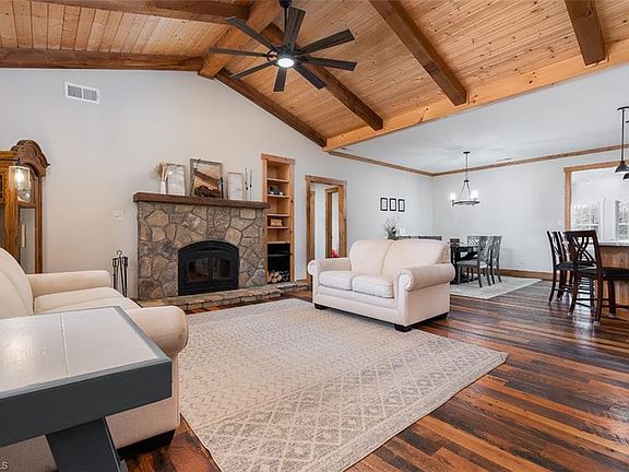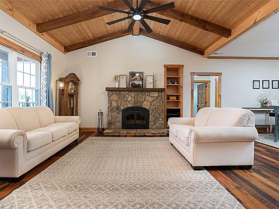 Discover the charm of this beautiful ranch home nestled on 10.96 acres! The spacious primary suite boasts a spa-like bathroom with dual vanities, a large walk-in shower, a separate tub, and a generous walk-in closet. Two additional bedrooms share a beautiful full bath. The kitchen features ample space and a pantry, while the family room is centered around a cozy wood-burning fireplace. Enjoy natural light in the large den or relax on the inviting covered front porch. The backyard is perfect for outdoor living with a portion fenced. Conveying with the home are the fridge in kitchen, microwave, and a zero-turn riding lawnmower. Listed below pre-listing appraised value—don’t miss out!