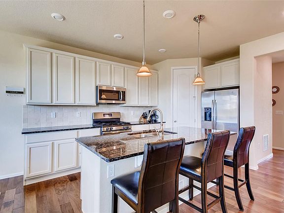 Wow! 2-year young house for under $425,000 PLUS solar for low electric bill! Upgraded, gourmet kitchen with high end Granite, white 42" Cabinets, tile back splash, large island and Stainless Steel Appliances. Spacious dining area and family room. Hardwoods on the main floor. 4 bedrooms all on the same level. Large Master bedroom with amazing mountain views, master bath with granite counter tops. Large unfinished basement to expand. Private backyard with no neighbors behind and a large patio for entertaining. Plus solar for a discounted electrical bill with no cost to the buyer for the panels or the maintenance of the panels! 100% move in ready! Easy 7 minute access to I-25 and shops!