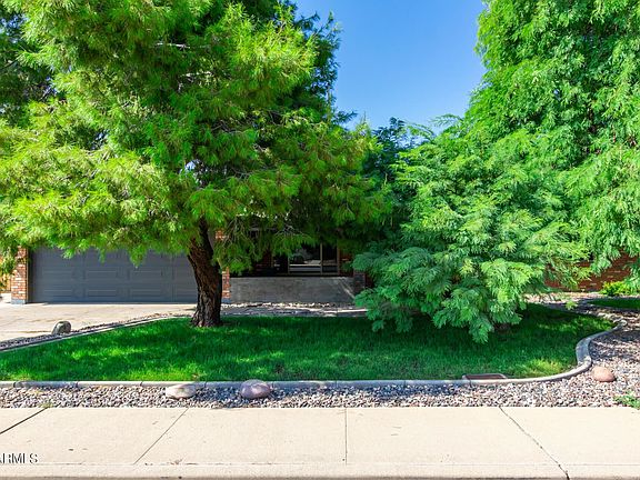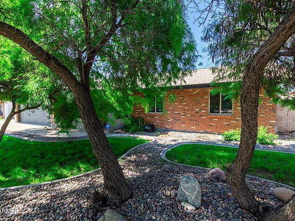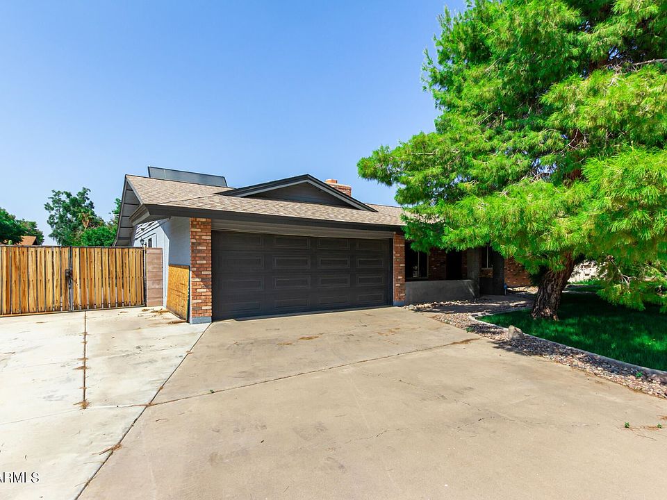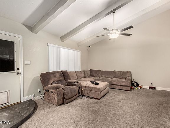 Amazing opportunity to own this fabulous 3 bed, 2 bath property! Lush green landscape w/shade trees. Discover the beautifully remodeled interior w/dramatic vaulted ceilings w/exposed beams, large picture window, plush carpet, upgraded lighting/ceiling fans, and two-way modern fireplace into the spacious family room w/backyard access. Stunning chef's eat-in kitchen with granite counters , smart SS appliances, tile floors, recessed lighting, and breakfast bar. The main retreat boasts plush carpet, large window, and grand ensuite with dual sinks, walk-in closet, and designer's tile shower. The large backyard offers a cozy covered patio, shimmering pebble tech diving pool, storage shed, RV gate, and fountain. Just added solar water heater. Arizona room. Too many upgrades to list! Selling AS IS