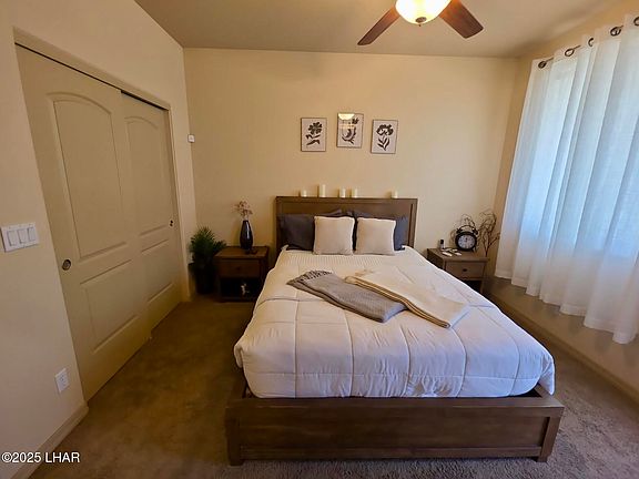 Discover comfort, convenience, and adventure in this beautifully maintained 1‑bedroom, 1‑bathroom home featuring an open floor plan, granite countertops, stainless steel appliances, a paid solar system, and exceptional pride of ownership throughout. The property includes both an RV garage and a single‑car garage—each equipped with mini‑splits for year‑round comfort—making them perfect for storing an off‑road vehicle or golf cart and creating an ideal basecamp for desert explorers. Located just moments from open desert trails and a short drive to the Colorado River and Lake Mohave, this home offers endless opportunities for boating, fishing, and outdoor recreation. The expansive backyard is a true retreat with a putting green, fire pit, and ample space to add a pool or casita, all set beneath wide‑open skies perfect for stargazing. With Bullhead City and Laughlin only 30 minutes away, this property blends peaceful living with easy access to entertainment, dining, and outdoor fun!