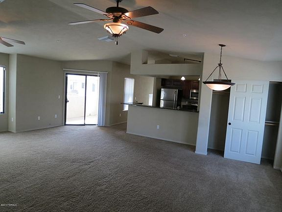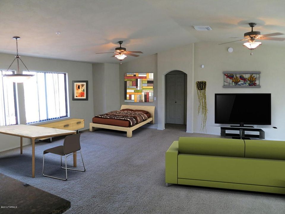 Super trendy loft studio with attached extended garage. Upper level end unit with fantastic open floor plan that's perfect for those sophisticated creative individuals seeking a unique living space. Kitchen and bath have been updated to the max, and include granite, stainless, dark wood cabinetry, tasteful ceramic and pendant lighting. Private covered patio. Gated community, easy private Rillito Riverwalk access, two community pools and spas, fitness and business center. Located 1/2 mile from St Philips Plaza with excellent shopping and restaurants, and weekend farmers market activities. Traffic light at Hacienda Del Sol makes those left hand turns on River Rd a breeze. Virtual staging may not be to scale.