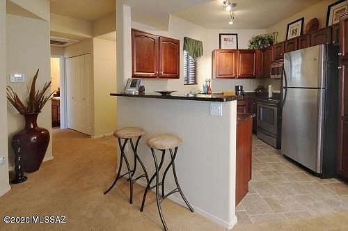 Beautiful one bedroom one bath condo in the ideal location of Rio Del Sol !. This one bedroom one bath features granite countertops and stainless steele appliances. Very well maintained as it was used as a corporate rental. Community has entrance to the River Walk with biking and running paths. Community features two pools, spa and onsite fintness center. Minutes to Tucson Mall, St. Phillips Plaza , The University of Arizona and the Farmers Market ! Furnishings can be sold on a sperate bill of sale. Offers for furniture and housewares being accepted separately.