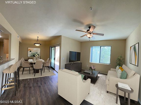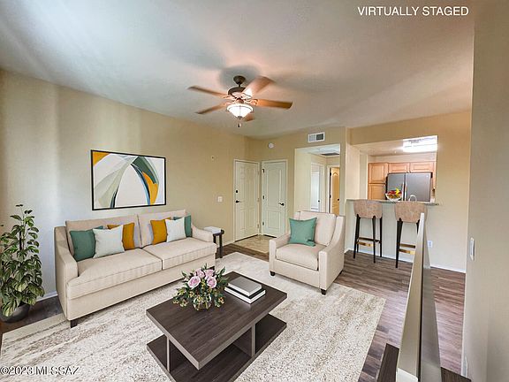 RANGE PRICING - Seller will counter or accept all offers between $309K-$315K. Seller will contribute to an interest rate buy down or closing costs with a full priced offer. This charming and contemporary second-floor corner unit is all set for its new owner! The open-concept layout showcases beautiful natural light throughout, wood laminate and ceramic tile flooring, granite countertops, GE Energy Star Slate Appliances in the kitchen, a breakfast bar plus dining area, and a fantastic covered deck that overlooks The Loop and city lights. Rio Del Sol boasts lush green surroundings, multiple BBQ areas, two pools, a fitness center, a community clubhouse, and easy access to the infamous Rillito River path. Plus, it's conveniently situated near St. Philips Plaza, which offers a wide range of... dining options. It's also just a short commute to the University of Arizona and some of the finest resorts in town.